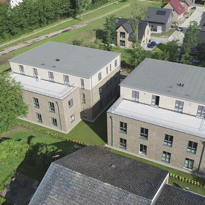 Advantic von oben: Am neuen Standort arbeiten die Mitarbeiterinnen und Mitarbeiter in zwei modernen Bürogebäuden am Rande eines Wohngebiets.